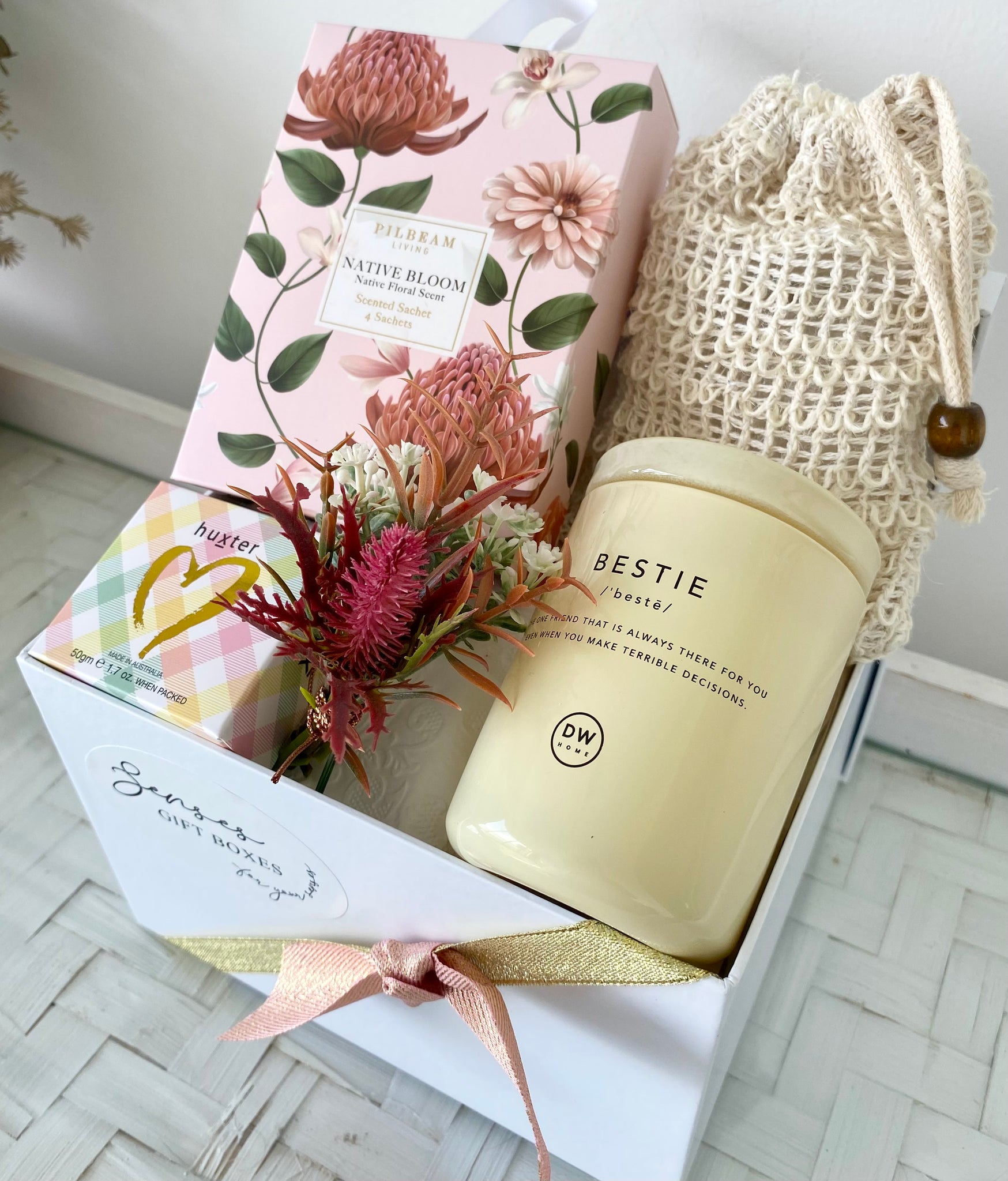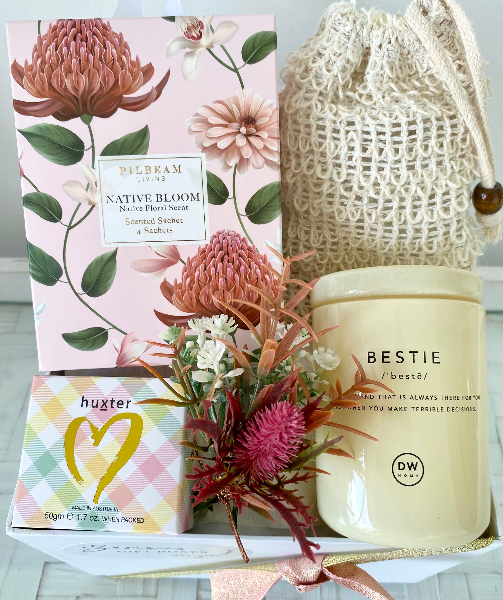 Celebrate a bestie with our affordable pretty gift This cute hamper includes a candle, soap and a variety of other special treats perfect for pampering and relaxation. Give the gift of pure bliss and make someone's day extra special.