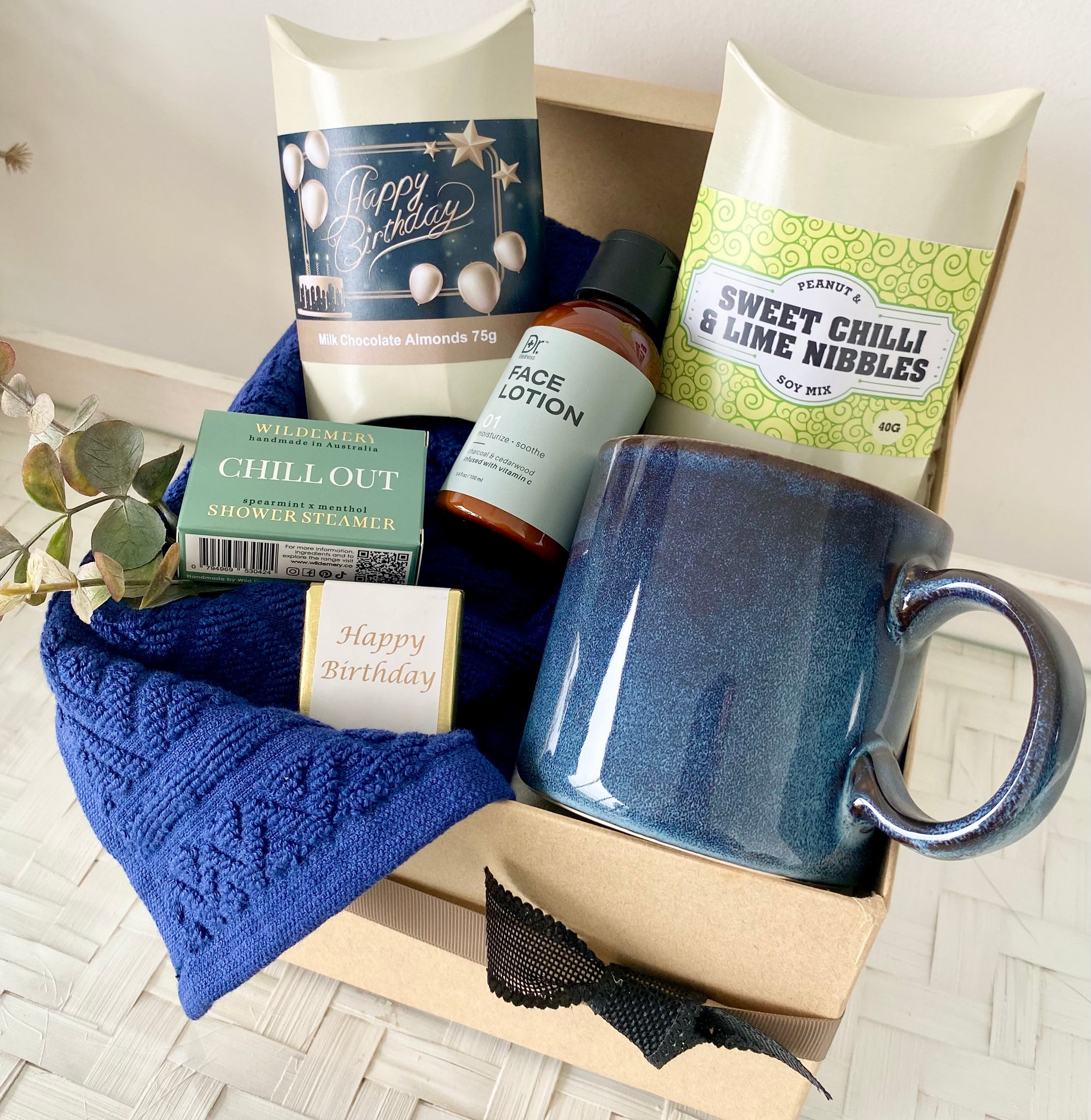 Treat a special man to our sweet treats & mug gift box Hamper! With a variety of delicious sweets and treats, perfect for any sweet tooth plus a lovely navy ceramic mug. This large hamper is made specifically for him on his birthday, making it the perfect gift.