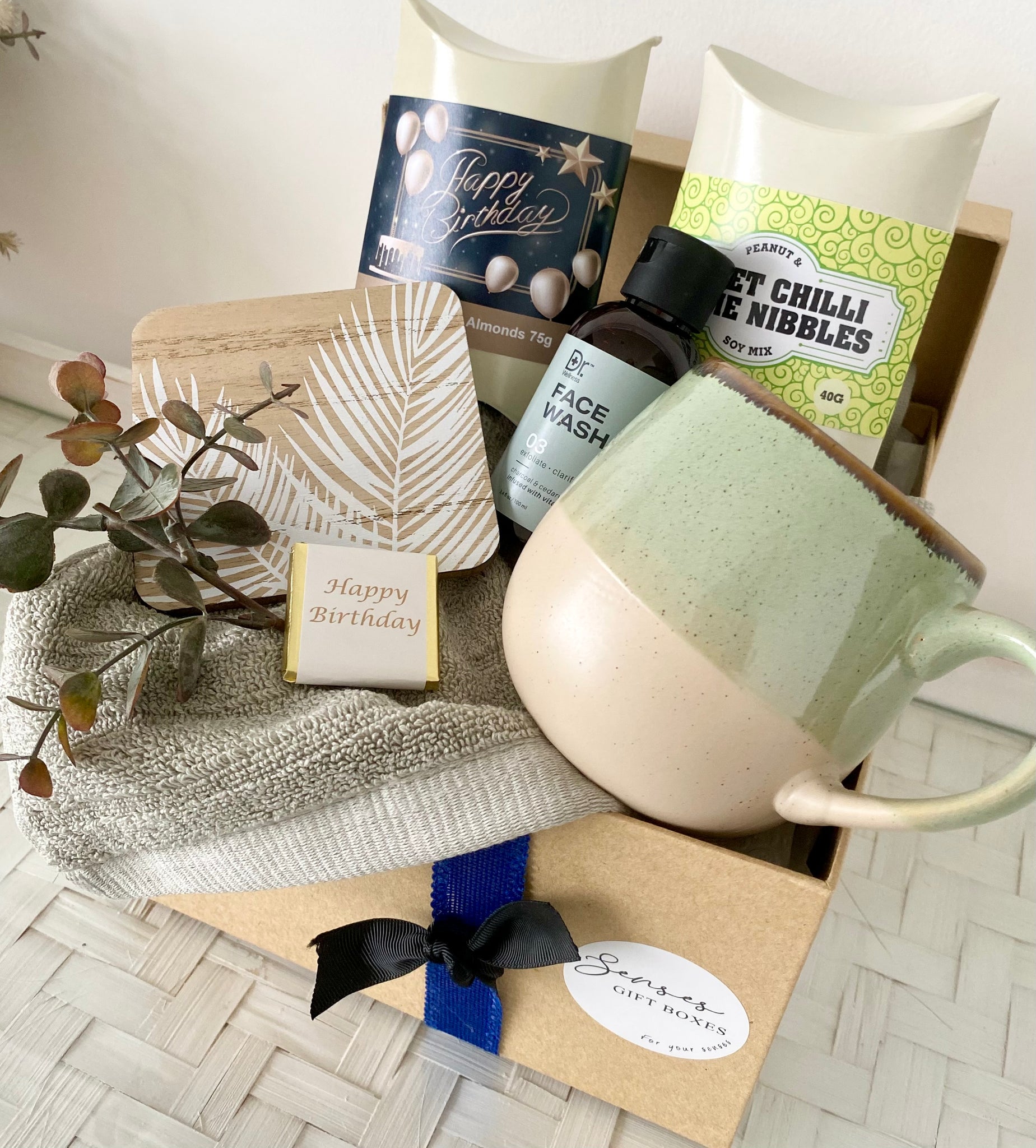 Treat a special man to our sweet treats & mug gift box Hamper! With a variety of delicious sweets and treats, perfect for any sweet tooth plus a lovely navy ceramic mug. This large hamper is made specifically for him on his birthday, making it the perfect gift.