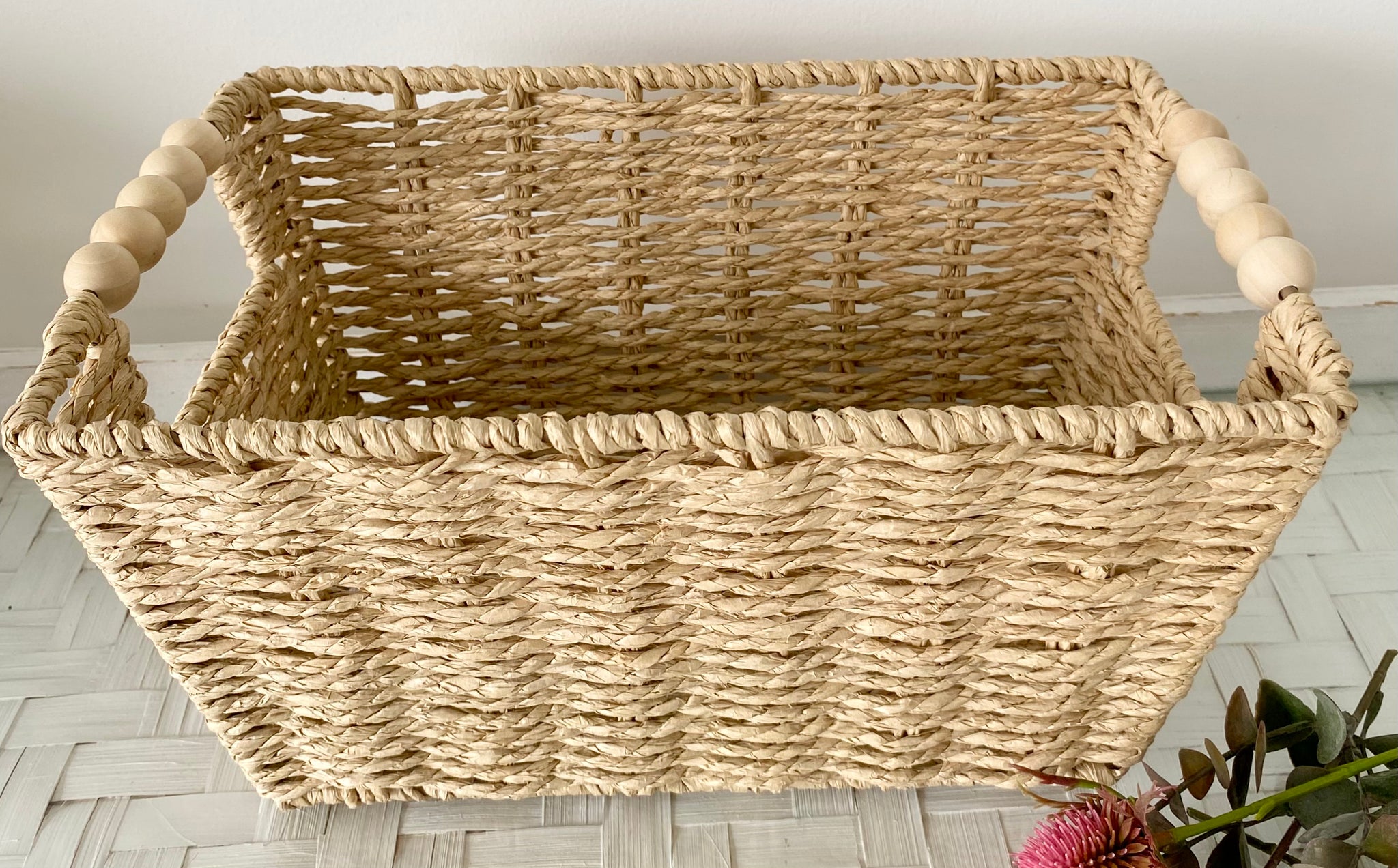 Basket - Lovely reusable woven natural basket with beaded handles