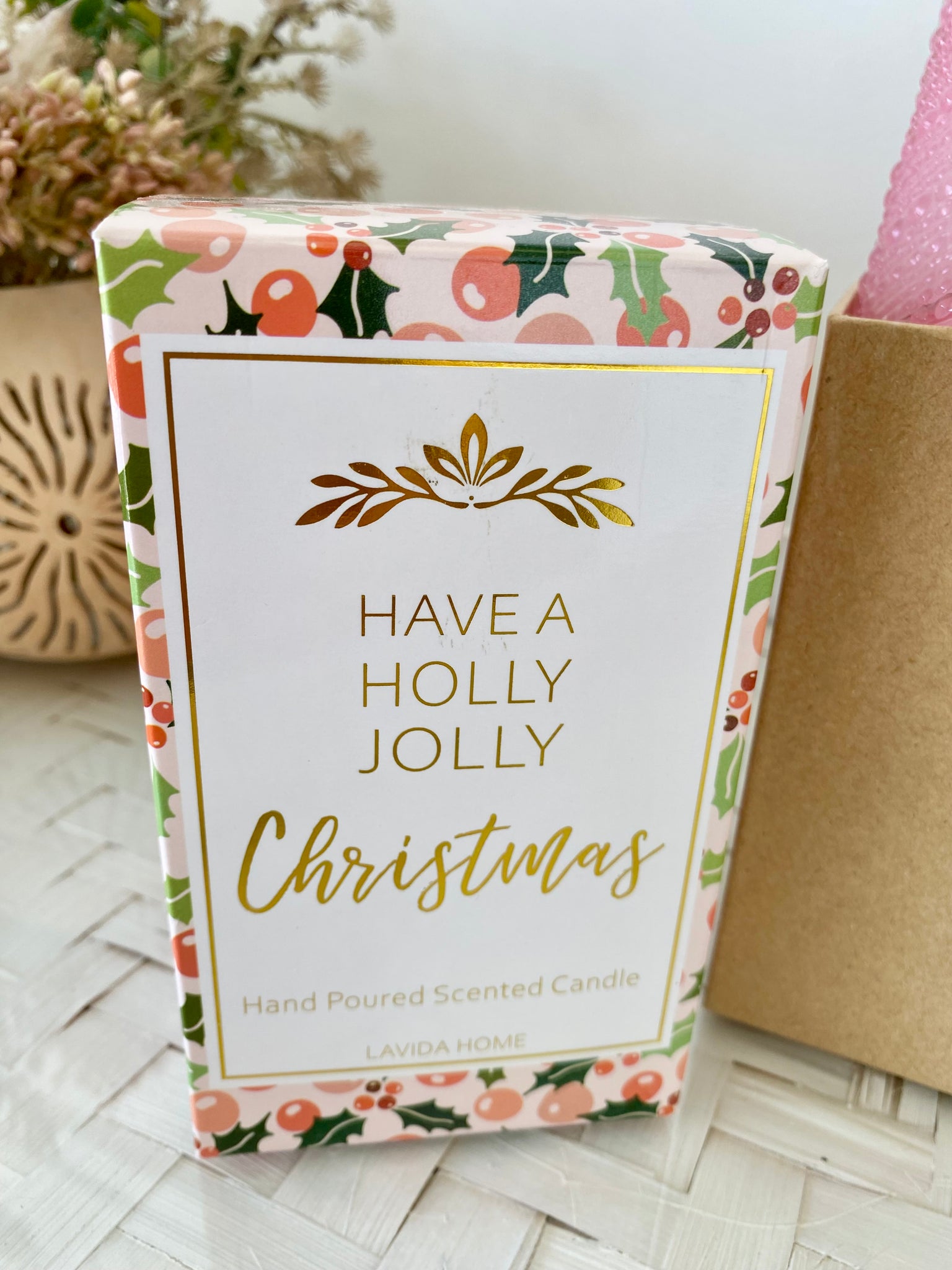 Candle - Large lovely Candle "Have A Holly Jolly Christmas" lovely scented candle in pretty pink glass jar with gold metal lid.
