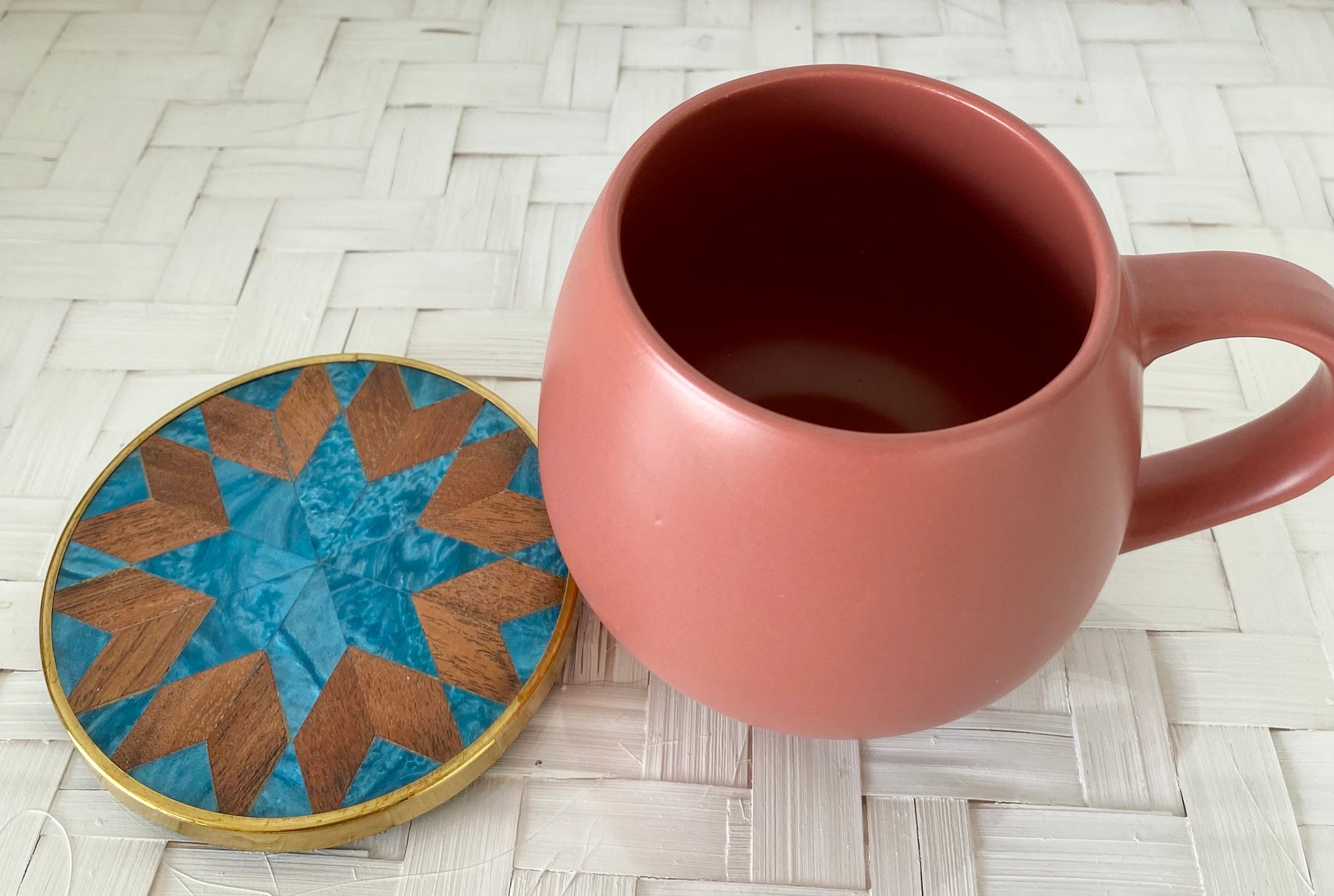 Coaster - Gorgeous wooden inlayed design coaster with gold metal edging