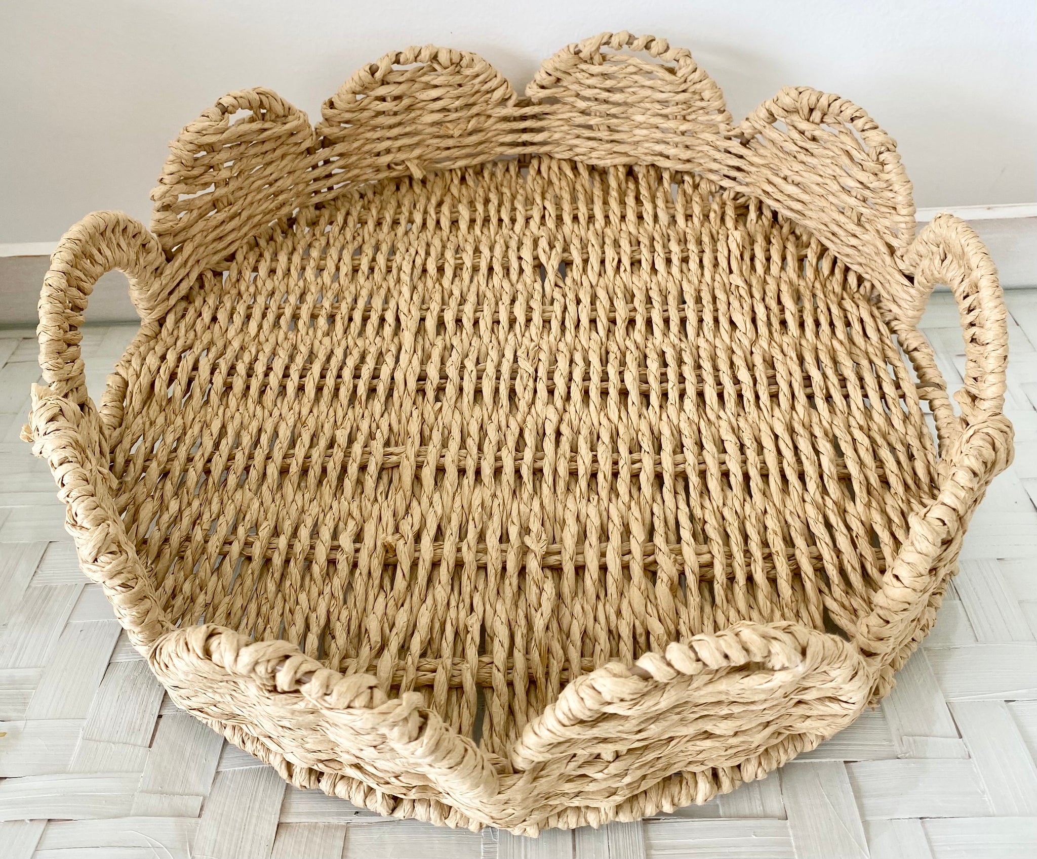 Basket - Lovely round scalloped reusable woven natural storage basket with cut out handles